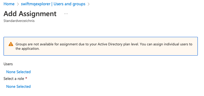 Go back to the menu entry Enterprise applications and click on swiftmqexplorer. Click on Users and groups in the left menu:
