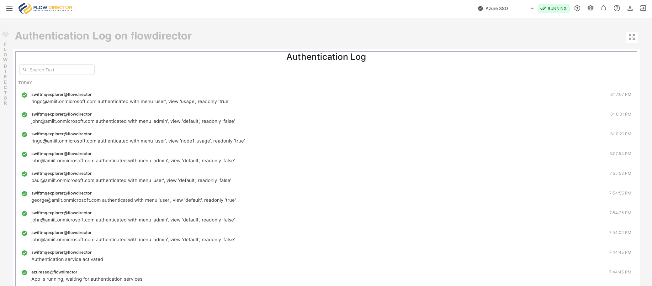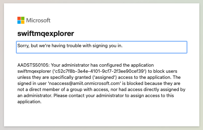 Now, access SwiftMQ Explorer app. You will be redirected to Azure AD and need to sign in with one of the four users. Repeat that will all four users. Each log-in should succeed and the users should have the permissions according to their assigned app role: