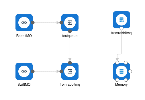 The above example defines a RabbitMQ inbound bridge on queue testqueue connected to the local SwiftMQ router as an outbound bridge to queue fromrabbitmq. AMQP 0.9.1 messages from the inbound bridge are passed to the outbound bridge and are automatically converted into JMS messages. You can then use a normal Queue Input component to receive the JMS messages from queue fromrabbitmq and you can process the messages.