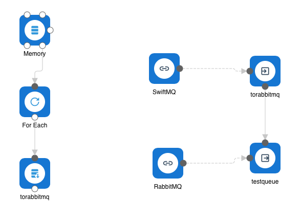 Here messages are sent within the flow as JMS messages through component Queue Output to queue torabbitmq, received from a SwiftMQ inbound bridge as converted AMQP 0.9.1 messages and sent to a RabbitMQ outbound bridge testqueue.