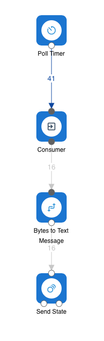 The Consumer component can connect to multiple topics at a Kafka cluster. It produces BytesMessage as output where the key is set as a String property and the value as the body. StringDeserializer is used for the key, and ByteArrayDeserializer for the value.