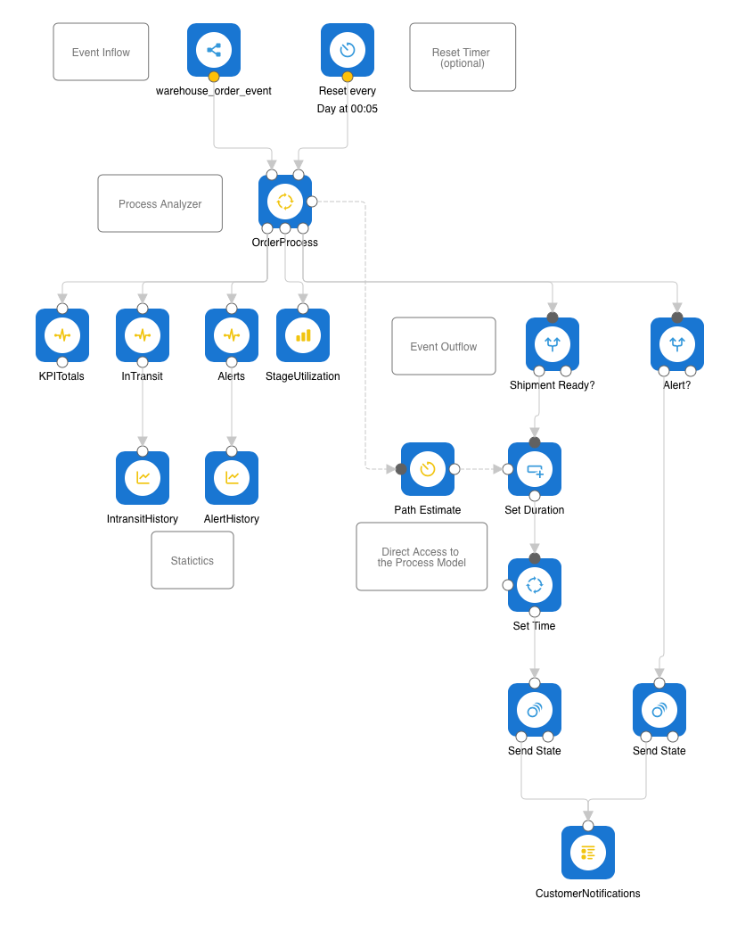 In the above example, we use the Warehouse sample that already sends correctly defined event messages with a unique key, a stage, and a single KPI value set and sends it to the topic warehouse_order_event. So we only need to listen there and feed it into the Process Analyzer.