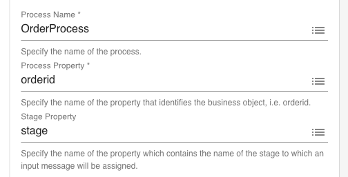 Specify a unique process name. Then specify the name of the property that contains the unique key. This identified your business object. Also, specify the property where you store the name of the stage.