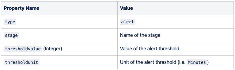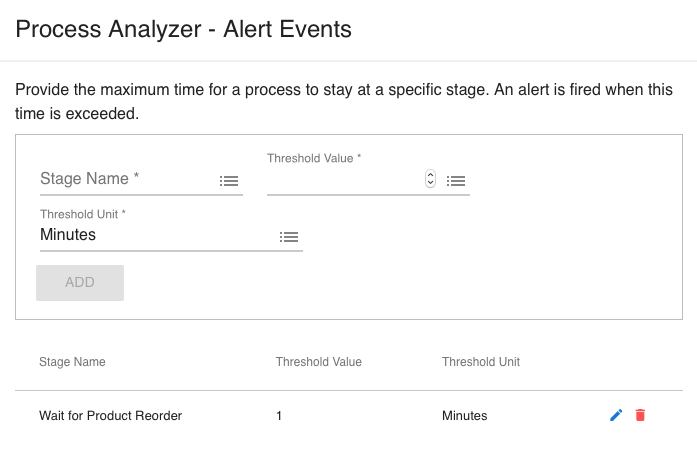 You specify the stage name, threshold value, and unit. The dashboard component will show these alerts visually, and the Process Analyzer will send an alert event through its event output connector.
