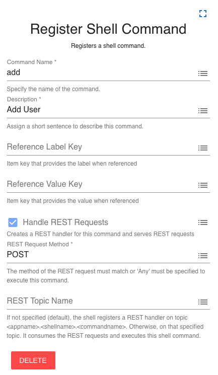 The Register Shell Command component has additional properties to make this command REST aware: