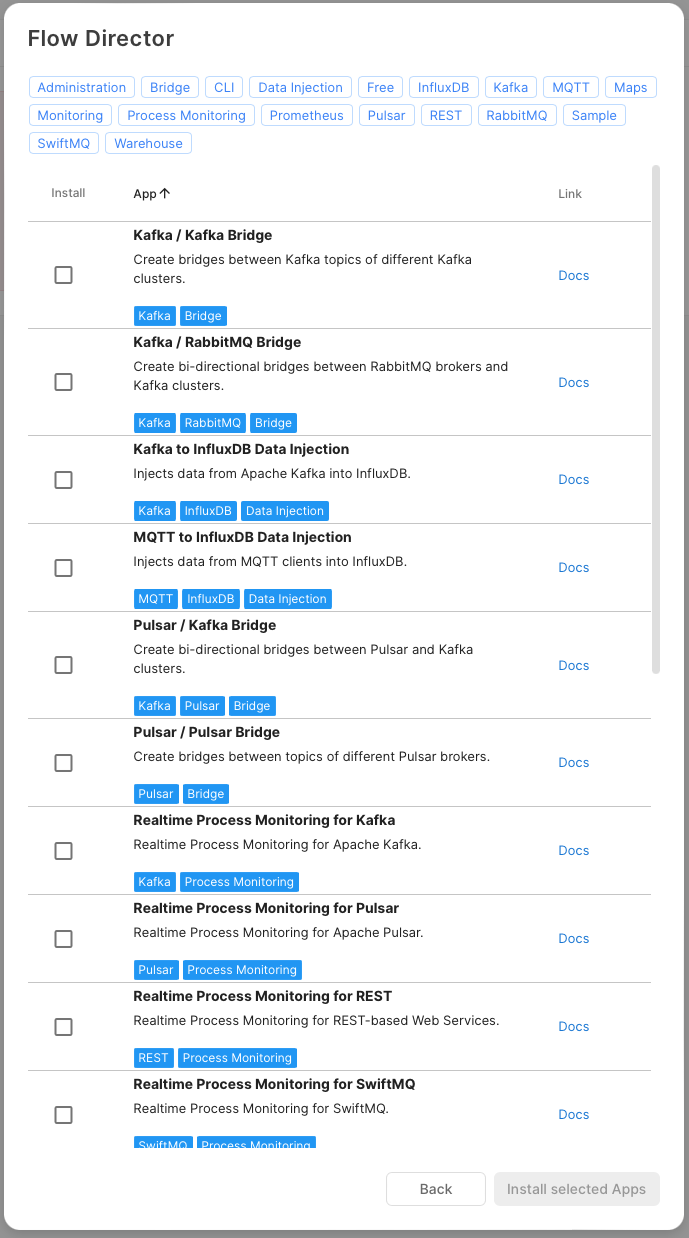 You can use the tags to filter the display. Click the Install checkbox to select the apps. Some might require a license when you log in to the app. Click