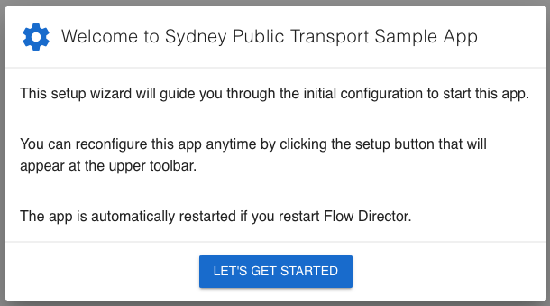 All the Flow Director app library apps are automated (see the Automation chapter later in this document). That is, flows and dashboards are auto-started after installation. Some require information from the user before they can be started. For these, a setup wizard runs after the first successful login: