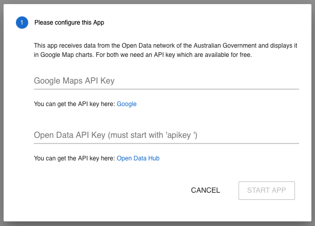 Please press the button, and the wizard will request the information it needs to auto-start the app. In this example, the wizard of the Sydney Public Transport sample app requests 2 API keys: