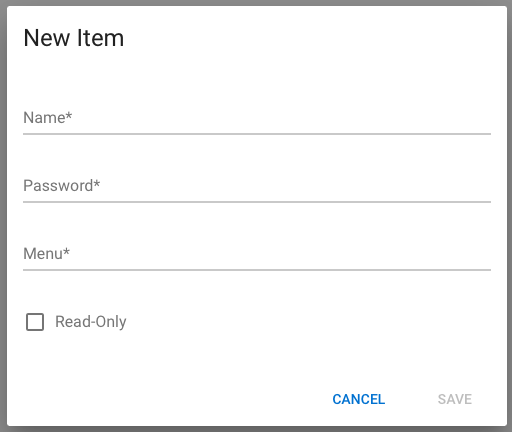 Specify name and password. The menu is the name of the menu assigned to the user. If you check the Read Only box, the user cannot execute any change operation.