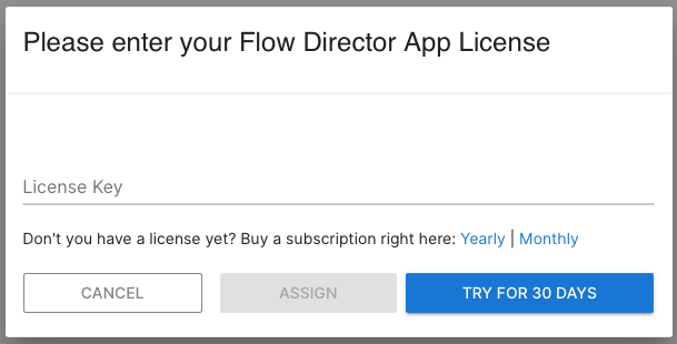 If you don’t have a license yet, you can purchase it right from here. The license key comes via eMail and needs to be entered in the above dialog. You can use a license for any app. Once you press ASSIGN, the license key is assigned to this app on this Flow Director instance and is occupied. It is released when you delete the app via System app. If you press CANCEL, you are logged out.