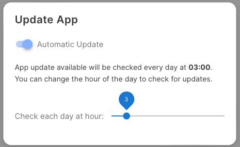 The above is the default. It checks every night at 3 AM whether updates of this app are available and updates it, if necessary. Corresponding flows and dashboards are restarted so that an update does not require any manual intervention.