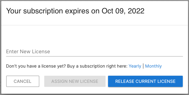 Click on it to see the current subscription expiration. You can enter a new license key or release the current license from this Flow Director instance: