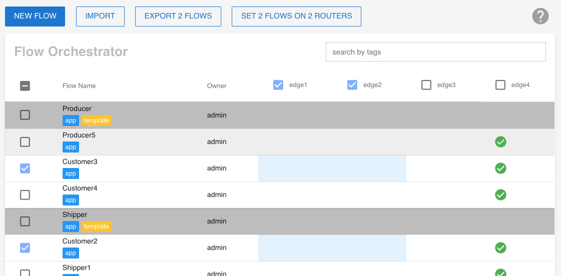 Simply select the flows, and the target nodes, and a Set x Flows on y Routers button will appear on top of the table. This will bring up the multiple flow setter dialog, which you can then proceed to execute an action on multiple flows, and routers at once.