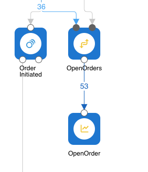 The connections of the flow viewer automatically update to show the throughput of the connection. The throughput number is the aggregate of messages sent for the given connection within the defined time interval, referred to as the Reset Interval. You can specify the desired interval in order to obtain a throughput number relevant for your use-case. For example, how many orders are received per day?