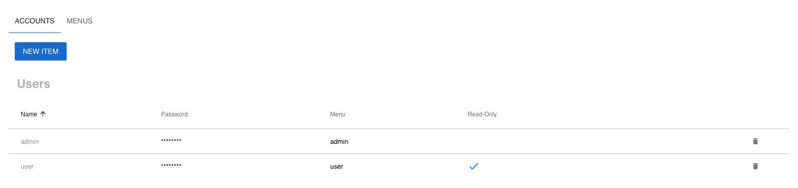 User admin is the app administrator and has full rights. User user is a read-only user.