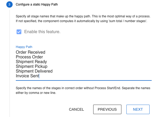 You can optionally define a static Happy Path to create a reference path for all processes. All variants of this path are shown as deviations. If you don’t define it, the Happy Path is built dynamically.