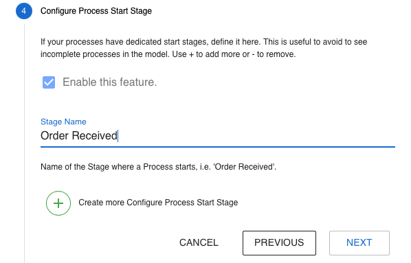 In this example, we use our warehouse example to define Order Received as a start stage. If your processes can have multiple start stages, you can define them by clicking on the + button.