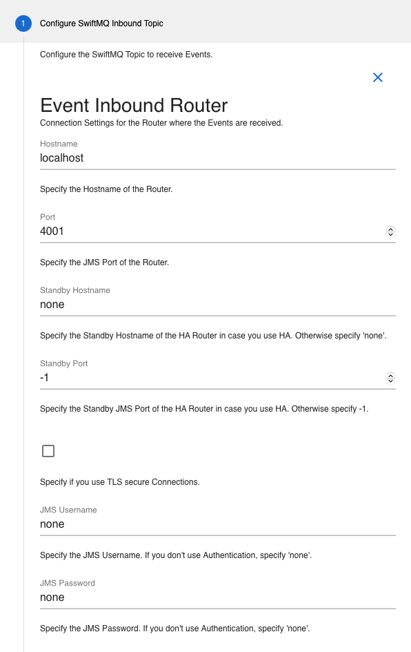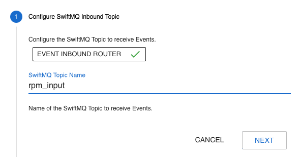 The first step is to configure the SwiftMQ inbound topic to receive events: