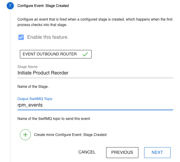 This step configures events when a stage is created. The events are sent to a SwiftMQ topic: