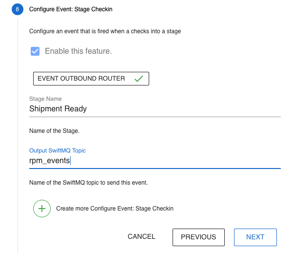 This step configures events when a process checks into a stage. The events are sent to a SwiftMQ topic.