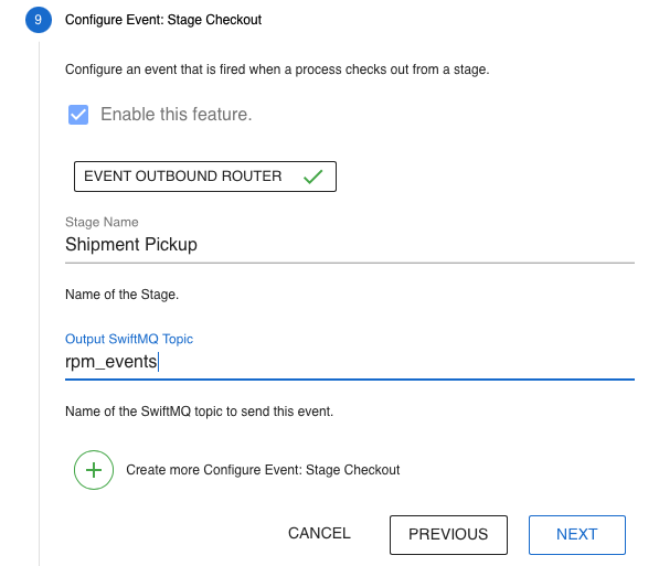 This step configures events when a process checks out from a stage. The events are sent to a SwiftMQ topic.