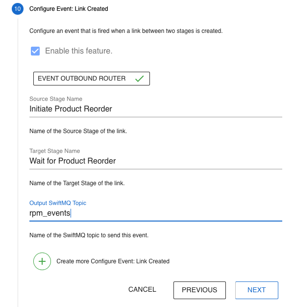 This step configures events when a link between two stages is created. The events are sent to a SwiftMQ topic.
