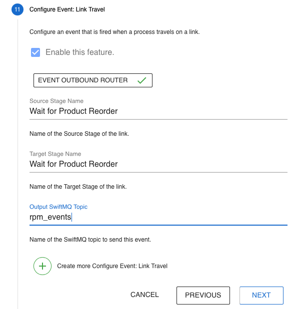 This step configures events when a process travels on a link. The events are sent to a Pulsar topic.