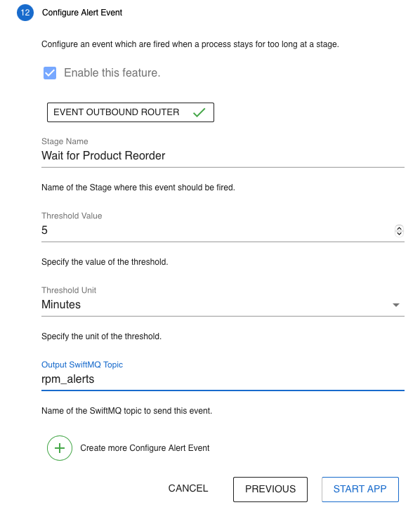 This step configures alert events when a process stays at a stage too long. The events are sent to a Pulsar topic.