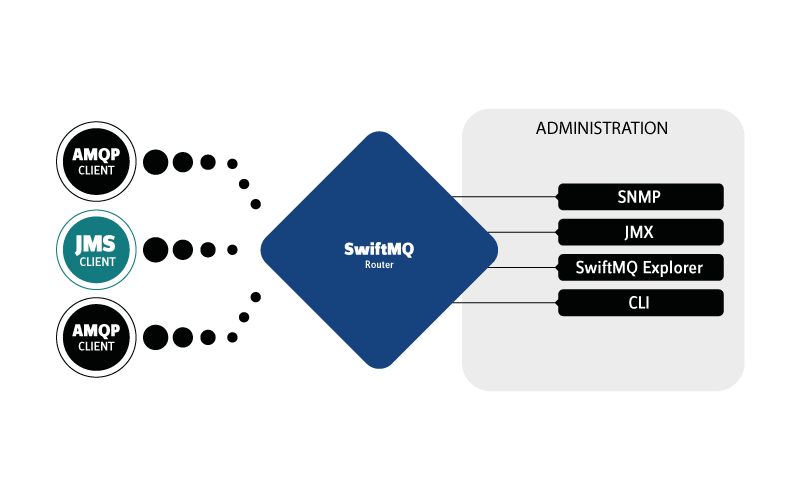The AMQP Swiftlet is fully integrated with the SwiftMQ Router environment. Administration and monitoring take place by SwiftMQ's well-known administration tools SwiftMQ Explorer, CLI, and JMX: