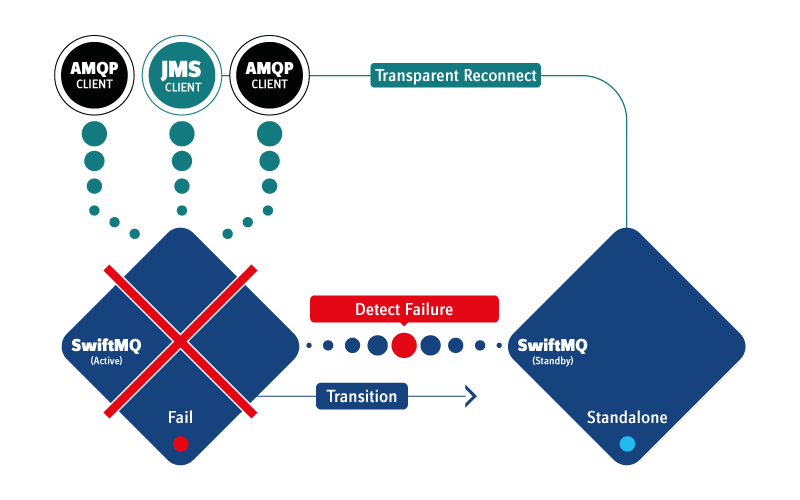 Transparent reconnect in the case of failover between SwiftMQ HA instances is a feature of SwiftMQ's JMS client. AMQP is a protocol so transparent reconnect has to be done on top of it - inside AMQP client libraries. SwiftMQ's AMQP 1.0 Client does support non-transparent reconnect via link recovery.