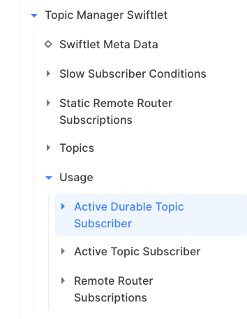 To create a durable subscriber with SwiftMQ Explorer App, select the node Active Durable Topic Subscribers of the Topic Manager Swiftlet's Usage folder: