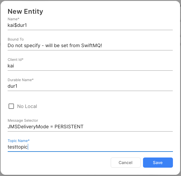 The Name has to of <clientid>$<durablename>. Bound To will be set from SwiftMQ during the creation of the durable subscriber and contains its queue name. After pushing the Create button, the durable subscriber is created and can be used by JMS clients: