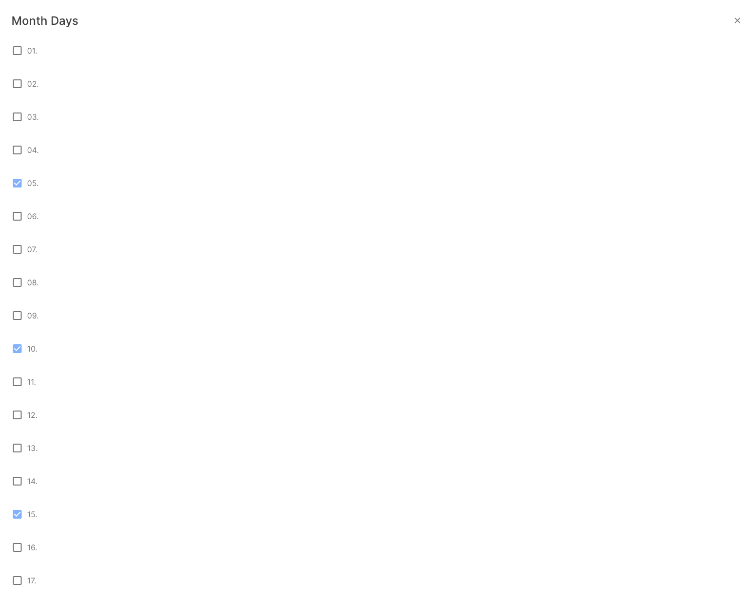 The above example enables the days 5, 10, and 15 of a month. If the calendar is of type include, only these days are valid and the rest days of the month are invalid. If it is exclude, all days of the month are valid, except the marked days.