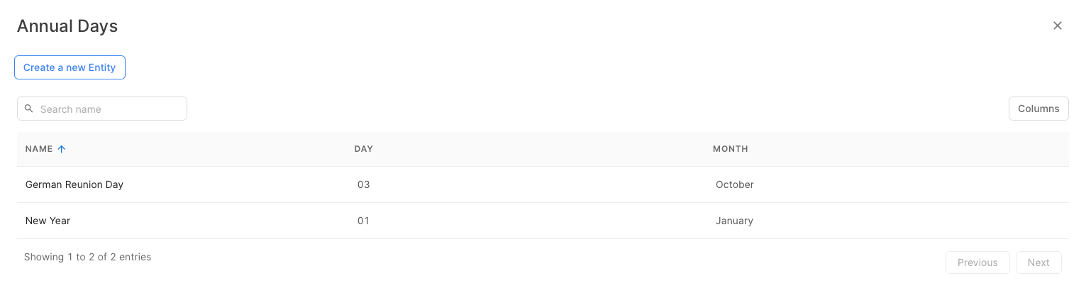 The above example defines 2 annual days, the 1st of January (New Year) and the 3rd of October (German Reunion Day). Since it is of type exclude, these days are excluded.