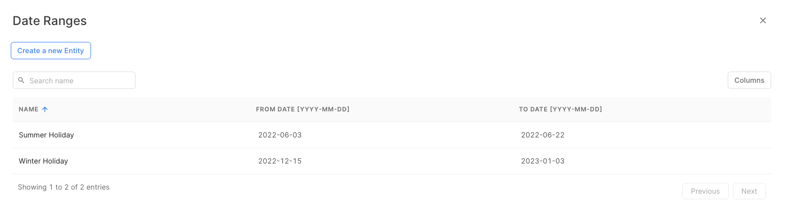 The above example defines 2 date ranges, Summer Holiday and Winter Holiday. Since it is of type exclude, these date ranges are excluded.