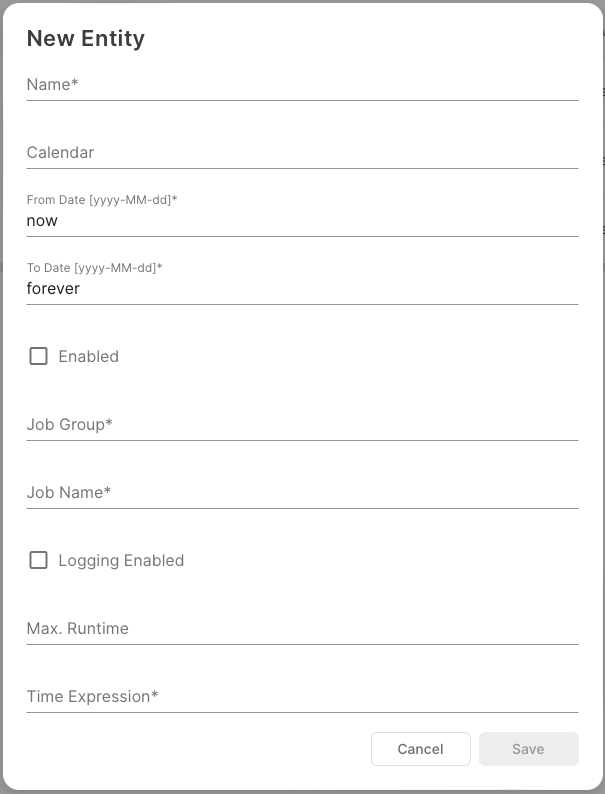 Max. Runtime | The maximum runtime of a job. Optional and depends on the job. The format is "<n>('h'|'m'|'s')", e.g. 1h is one hour, 30m is thirty minutes and so on. If specified, a job instance is explicitely stopped from the Scheduler Swiftlet after this amount of runtime. |