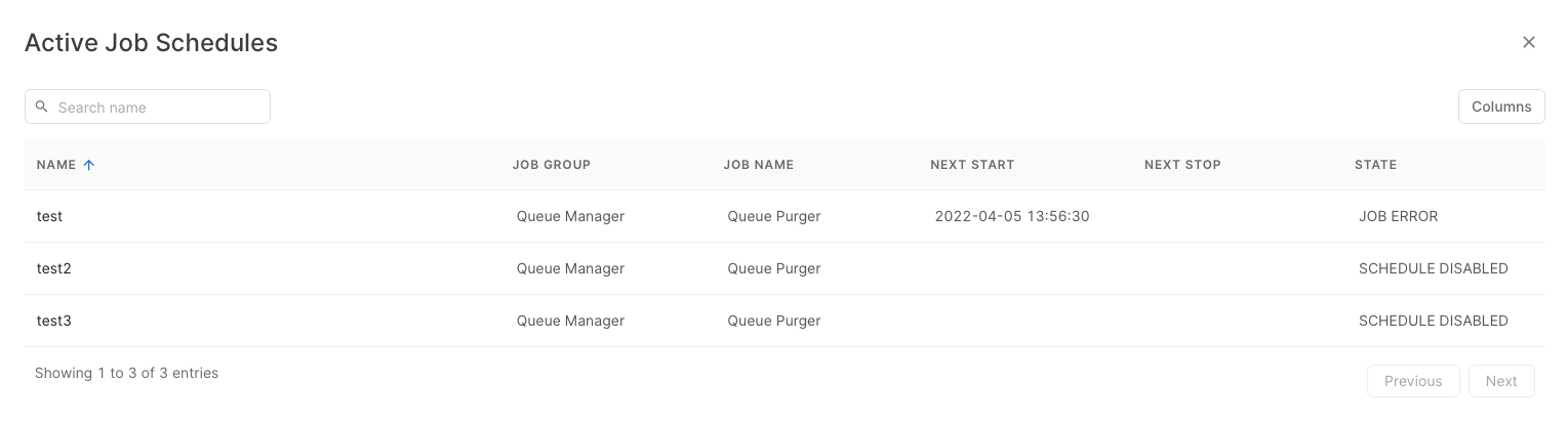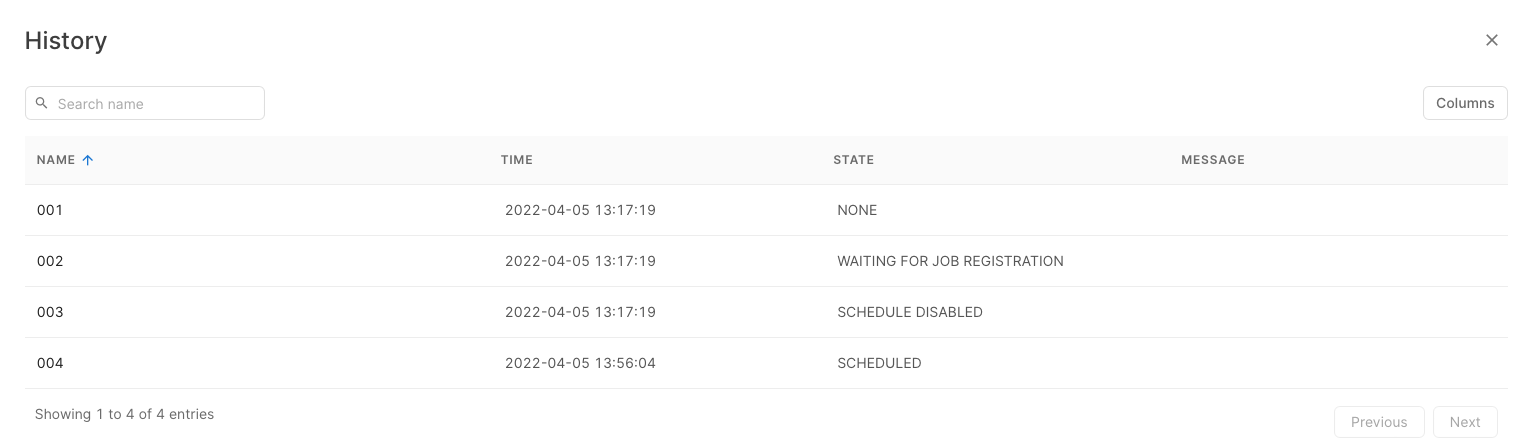The Scheduler Swiftlets provides 2 scheduler tables to view the status of all scheduled jobs. Each job contains a history of the last 20 job events. A schedule can be log-enabled to log each start/stop in the router's log file.