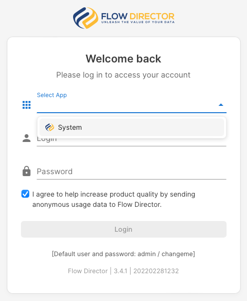 Chose System app and log in. The default username is admin, the password is changeme.