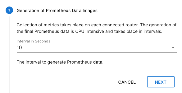 The first step is to specify the interval to generate data images in native Prometheus format. This is done on each connected router. The images are generated and available via REST.