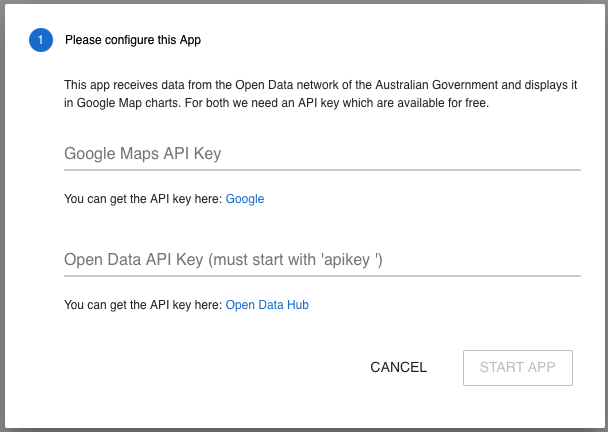 This app requires that you have an API key for the Australian government's Open Data portal and Google Maps. Both are free; only registration is required. Get them here: