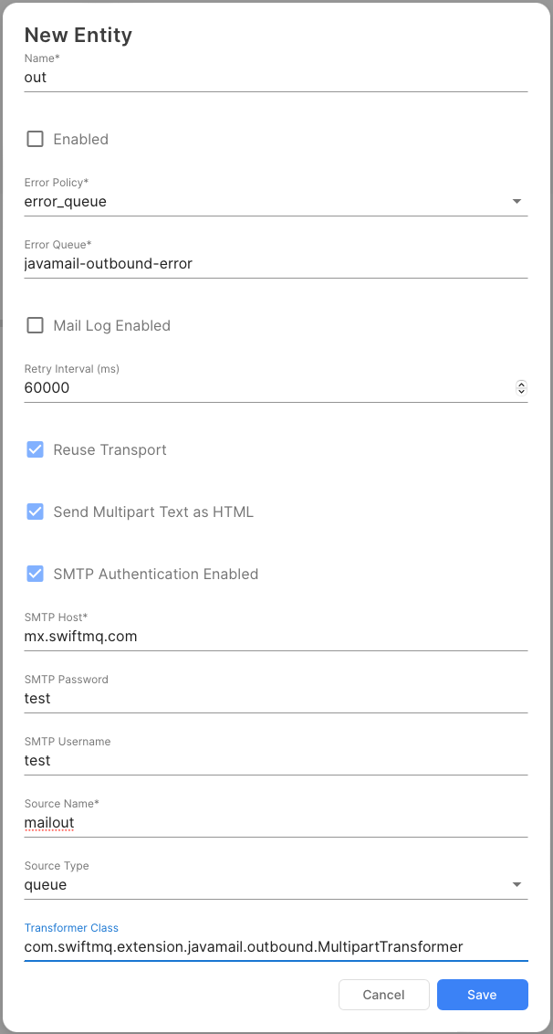 transformer-class | Default: com.swiftmq.extension.javamail.outbound.TextMessageTransformer |