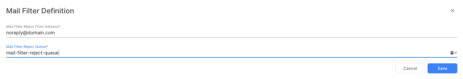 mail-filter-reject-queue | java.lang.String | Yes | Name of the Queue to forward rejected Messages |