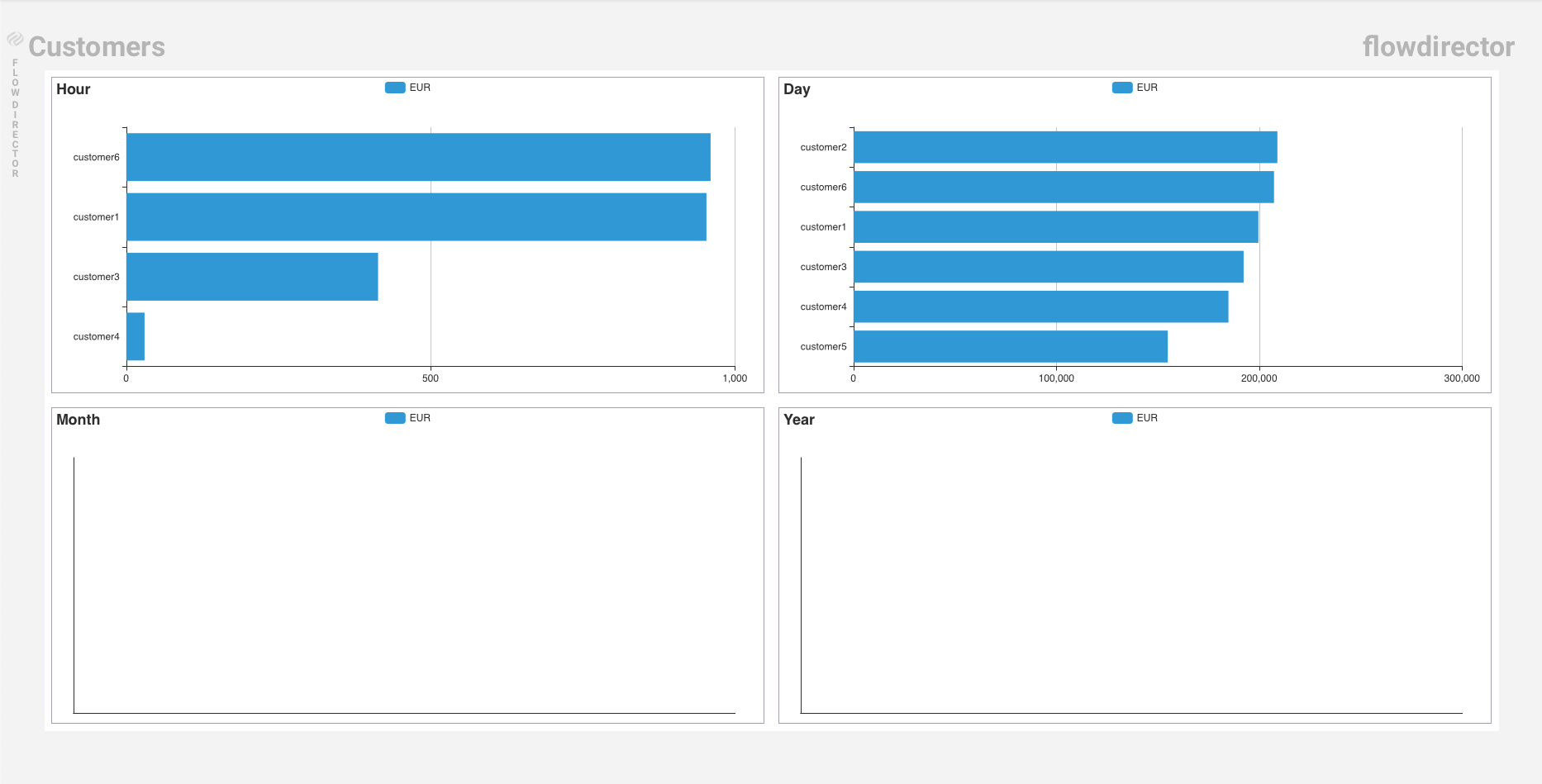 This dashboard contains group charts that display top-performing customers within the corresponding time frame.